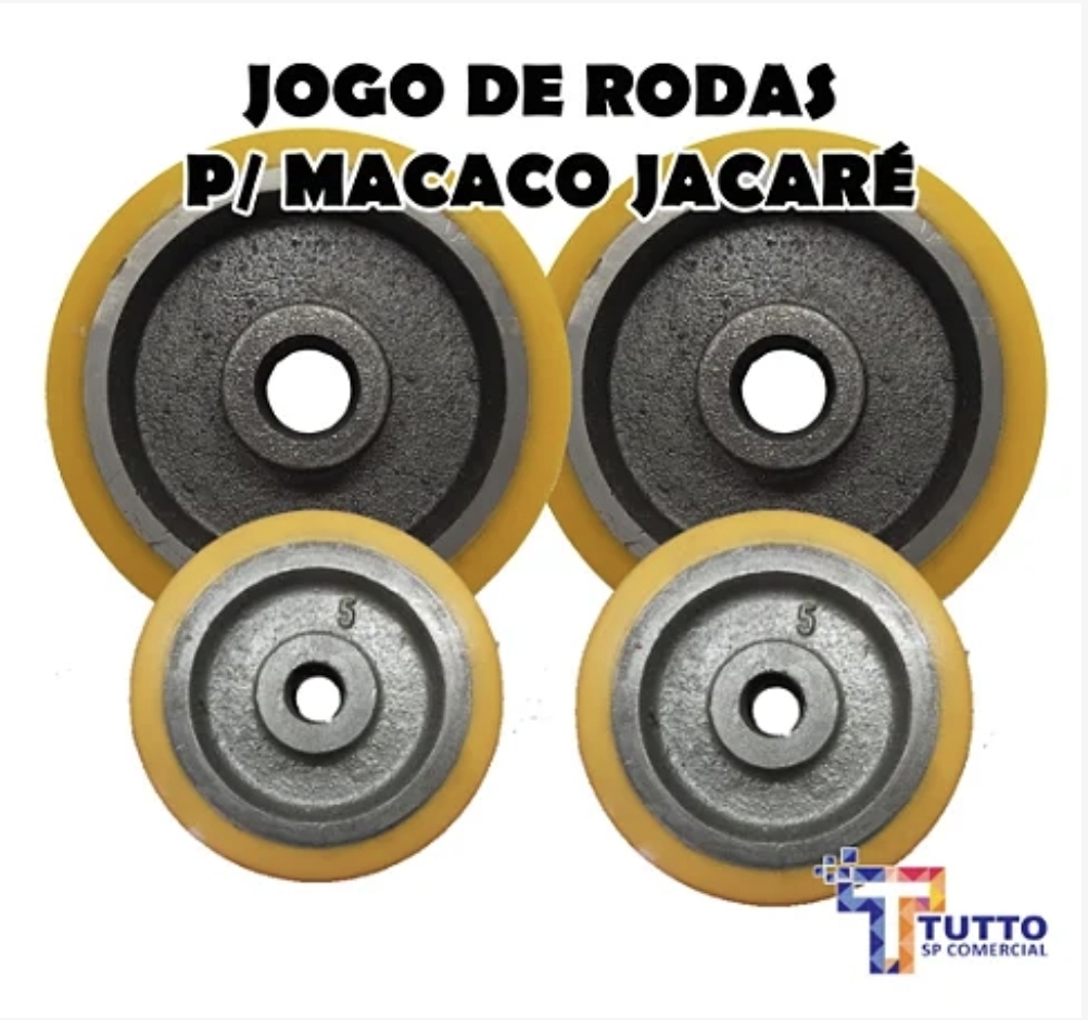 Descrição do produto: Jogo com 04 rodas de núcleo de ferro fundido, revestida em poliuretano pigmentada na cor laranja, compatível com equipamento Macaco Jacaré, com capacidade de carga de até 2 toneladas. Jogo composto por duas rodas de 4" de diâmetro + duas rodas de 3" de diâmetro.